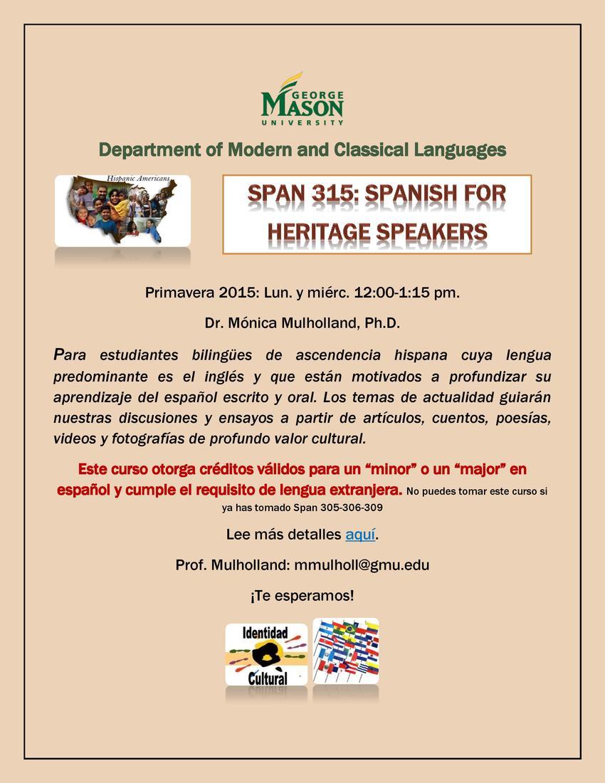Designed for students who have some communicative ability in Spanish, normally acquired in the home, who want to improve their reading and writing abilities while developing a critical understanding of Latin American, Latino, and/or Spanish histories and cultures. Course components include orthography and vocabulary activities, grammar review and practice, assigned readings in a variety of genres, critical cultural analysis, in-class discussions, written essays, and the viewing of films. Offered by Modern & Classical Languages. Limited to three attempts. Equivalent to SPAN 305, SPAN 306, SPAN 309.